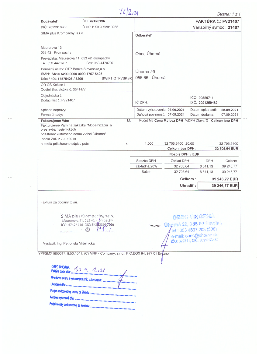 | Predmet | Modernizácia a prestavba hygienických priestorov kultúrneho domu v obci Úhorná |